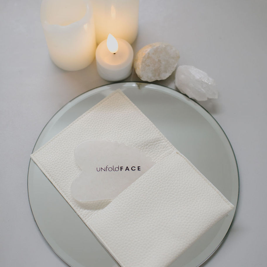 → A tactile cream storage wallet - made from soft vegan leather, with a magnetic closure to keep your tool protected and travel-ready. Beautifully understated, this pouch is as elegant as it is practical, perfect for storing your Gua Sha between rituals or taking it with you wherever you go.